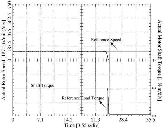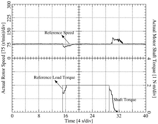 In the experiments, digital proportional-integral (PI) controllers are used in the speed and current loops. The initial rotor position is set to a predetermined value for proper start-up. Since the proposed position sensorless algorithm relies on the back-EMF based method, it is not possible to start at full load. Therefore, the motor is ramped from 0 to 360 r/min in 2 s under no-load. No instability is observed in the experimental no-load start-up using the proposed position sensorless scheme, as shown in Figure 7. Due to low sampling rate of the Magtrol dynamometer data acquisition system (Buffalo, NY, USA), in all experiments, the rotor speed and load torque data are obtained by the high resolution DAC module. During the steady-state speed of 360 r/min, a nominal step load torque (2 N·m) injection and rejection are applied, respectively. The resultant speed and shaft torque are provided in Figure 8. The satisfactory transient speed response is achieved under full load injection, and rejection with a reasonable low frequency oscillation without parameter detuning with K gain is chosen as 1.