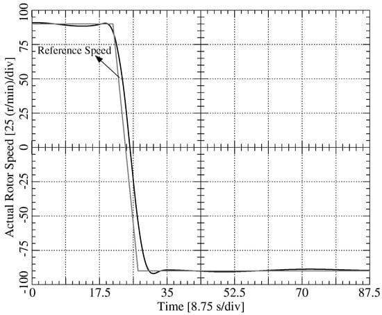 Experimental transient speed reversal test (±90 r/min) under full load (2 N·m) with (high) while is increased by 82.35% and is decreased by 40% of its original value.