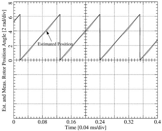Experimental steady-state (90 r/min) measured and estimated rotor position waveforms under full load (2 N·m) with (high) while is increased by 82.35% and is decreased by 40% of its original value.