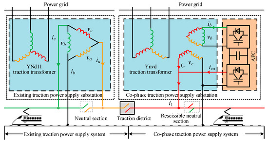 By the end of 2018, the operation mileage of the China railway had already reached 124 thousands kilometers. Among them is the high speed railway mileage, which reached 22 thousands kilometers. There is no doubt that the China railway is of great importance to China’s transportation industry. To the railway system, the traction power supply system (TPSS) is a crucial part that maintains stable and safe operation of railways [1,2,3]. The existing TPSS is shown in the left of Figure 1. The power supply distance of each traction substation is limited by the neutral sections, and the power supplied by each traction substation is incapable of interconnection [4,5,6,7]. As a result, when the train is running in regenerative braking mode, the power cannot be used by other locomotives because of the neutral sections. Then, the power is transmitted to a three-phase grid through the transformer, which causes the problem of large harmonic content and unbalanced voltage in three-phase power network. Because of the regenerative braking energy consumption, a large number of economic losses are caused [4]. Furthermore, the voltage range of the traction network is changed sharply, and the negative sequence, reactive power, and harmonic problems are brought into the present TPSS when the locomotives are under operation [8,9]. These problems influence the quality of the three-phase power grid, the operation efficiency, and the stability of the TPSS. Moreover, the locomotives need to decelerate and slide through the neutral section. In this way, the loss of speed and the decrease of the operation safety are problems that restrict the development of railways [10,11].