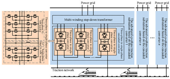 In order to link all the traction networks of every different substation, the advanced traction power substation system is proposed in literature [12]. The substation based on three-phase to single-phase converter is adopted in this system [13,14,15,16]. In order to adapt to the voltage level of three-phase grid voltage and the traction network voltage, the step-down transformer and step-up transformer are added to the three-phase grid and the traction network side, respectively. The neutral sections and problems of power quality in the traditional system can be avoided. However, it is difficult to meet the existing substation requirement of capacity because the structure is limited by the power electronic devices. The advanced co-phase traction power supply system (ACTPSS) based on three-phase to single-phase cascaded converter is proposed in literature [7], as shown in Figure 2. The ACTPSS achieves the interconnection of the whole traction network, thus all the neutral sections are reduced by ACTPSS. The negative sequence, reactive power, and harmonic problems existent in the traditional TPSS can be solved effectively [12,13]. Meanwhile, the voltage of the traction network can be maintained in a relatively stable range, and regenerative braking energy can be better utilized. Thus, the ACTPSS has become essential in the research and development of future TPSS.