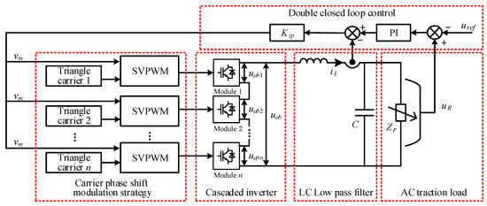The carrier phase shift strategy is used as the modulation strategy [25]. Every inverter model has the same modulation wave produced by the controller, while the triangle angle waves are different. The phase angle difference of two adjacent triangle angle waves is π/n, where the n represents the number of the inverter models. The single-phase SVPWM strategy is used as the modulation strategy to drive each inverter model.