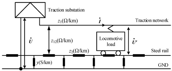 The original circuit model of the traction network is shown in Figure 5. Viewed from the output port of the traction substation, the impedance of the traction network consists of several equivalent impedances of the conductor-ground circuit [26].