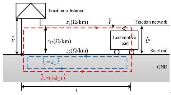 The simplified impedance model of the traction network is illustrated by Figure 6 [26]. The model is composed of two current loops. In the first loop, the current flows through the traction network and the ground. In the second loop, the current flows through the steel rail and the ground. The second current loop just reflects the induced current, which is far bigger than the conduction current. According to the light of this simplified impedance model, the unit length impedance of the traction network z can be figured out by the calculation of the self-impedance of the first and second loop.