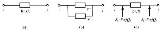 In Equation (18), the X is the line reactance of the original model, the R is the line resistance of the original model, and the unit of them is Ω. If we suppose that the real part of the Y″ is 0, the transmission line reactance of the traction network can be sufficiently larger than the resistance, and the condition Gijsinδij << Bij can be satisfied. To make sure that the power flow calculation will not be wrong and the system can keep balance after the change of the impedance, the lacking power part will be added by the other power sources in node i and node j. The way to add the power sources can be determined by Figure 7c. Combined with the node voltage and the modified Y″, the power of node i and node j can be illustrated as: