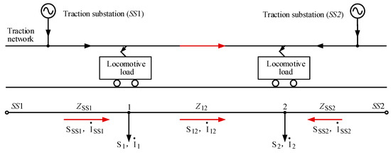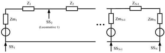 Assuming that the output voltage of the SS1 and SS2 are VSS1 and VSS2, and the currents I1, I2 of the locomotive are known, then Equations (21) and (22) can be simplified as: