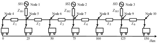 Under the ideal state, the output voltages of traction substation SS1, SS2, and SS3 are coincidental, thus they can be recognized as the balanced node. The ZSS1, ZSS2, and ZSS3 represent the resistances of the three traction substations, respectively. The value of them is set as 0.5 + j3.375 Ω in this model. The Zi (i = 1, 2 …6) represents the resistance of the traction network, and the value of unit length is set as 0.2527 + j0.298 Ω. The Li (i = 1, 2, …7) represents the seven locomotives, respectively, and the locomotive can be seen as a PQ node because the power of locomotive is constant. In conclusion, the system model is composed of 10 nodes.