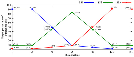 The relationship between the location of the locomotive and the output power ratio of the traction substation.