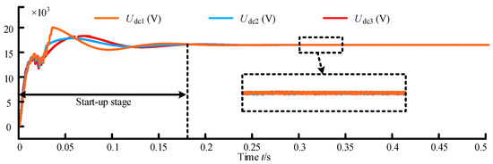 The output voltage waves of the three-phase 3L-NPC rectifiers are shown in Figure 12, and it can be known that the voltages could achieve stability after about 0.17 s. As the output waves appeared, the second-order ripple was suppressed by the LC filter. By the rectifiers, the steady and reliable DC voltages could be obtained.