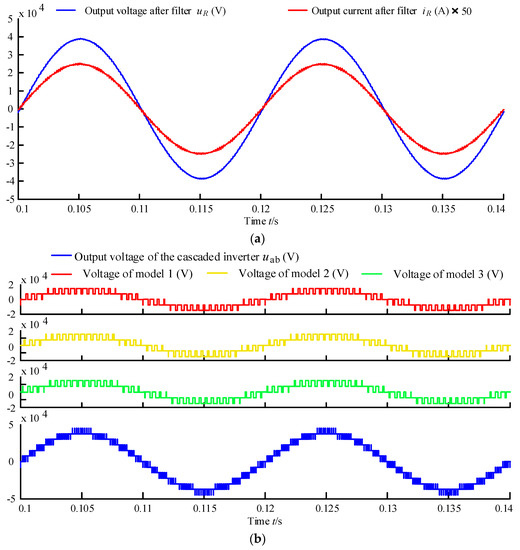 The output voltage and current waves of the three-model 3L-NPC cascaded inverter after filter are illustrated by Figure 13a. The uR and iR are the output voltage and current after the filter, respectively. In order to display the voltage and the current wave of output load properly and in the same scope, the current waveform was expanded by 50 times, the output voltage and current waveform were closed to the standard sine waves, and the output voltage that had little harmonic component and high power factor could be provided by the cascaded inverter. The 5-level output voltage waves of the three-inverter and the output voltage of the cascaded inverter are shown in Figure 13b. The uab is the 13-level output voltage of the three-model cascaded inverter, of which the effective value is 27.5 kV. The feasibility and availability of the cascaded inverter’s control strategy and modulation strategy have been verified by Figure 13.