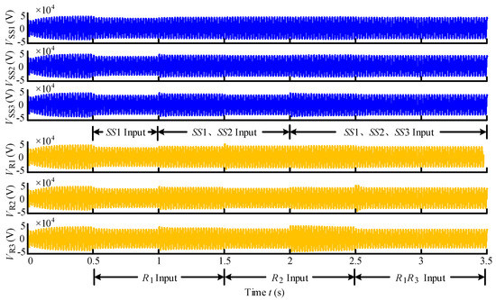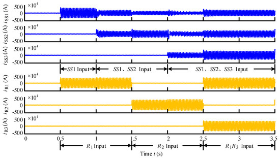 The traction substation 1 (SS1) was connected with the traction network at 0.5 s, the start of the system operation. The traction substation 2 (SS2) was connected with the traction network at 1.0 s, and the traction substation 3 (SS3) at 2.0 s. In 0.5–1.0 s, only the R1 was under operation, and the power was provided to the R1 only by the SS1, thus the current of the R1 was the same as the current of the SS1 at this period. In 1.0–1.5 s, the power was supplied to the R1 by both the SS1 and the SS2. In 1.5–2.0 s, only the R2 was under operation, and the power was supplied to the R2 by both the SS1 and the SS2. Because the distance between the R2 and the SS2 was shorter, the power supplied by the SS2 was more than that supplied by the SS1. In 2.0–2.5 s, the power was supplied to the R2 by the SS1, the SS2, and the SS3. Because the location of R2 was between the SS2 and the SS3, the power provided by the SS1 was the least. In 2.5–3.0 s, the R1 and the R3 were under operation, and the power of them was supplied by the three traction substations together. At this period, the R3 was on the right side of the SS3, and the power provided by the SS3 was more than that supplied by the SS1 and the SS2.