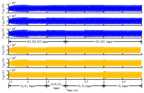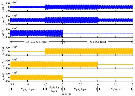 The output current waves of the traction substations and the current waves of locomotives in 3.5–7.0 s are exhibited in Figure 16. In 3.5–4.5 s, the R2 and the R3 were under operation, and the power of them was supplied by the three traction substation together. Because the distance between the R2, the R3, and the SS1 was longer, the power supplied by the SS1 was the least. In 4.5–5.0 s, the R1, the R2, and the R3 were under operation, and the power of them was also provided by the three traction substations together. Because the R3 was farther from the SS1 and the SS2 than from the SS3, the power supplied from the SS3 to the R3 was the most. In 5.0–6.0 s, when the SS3 was excision because of fault, the R1 and the R2 were still under operation and obtained the power from the SS1 and the SS2. In 6.0–7.0 s, the R1 was under operation and located between the SS1 and the SS2. The power was supplied to the R1 by the SS1 and the SS2 equally.