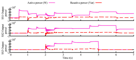 The output active and reactive power of the traction substations are illustrated by Figure 18. The converters inside the locomotives were controlled to operate with the unity power factor, thus the locomotives could be considered the pure resistance load. Therefore, under the steady operation of the locomotive, the reactive power was almost zero. When the locomotive started up or broke, the reactive power was outputted to achieve the power balance of the traction network.