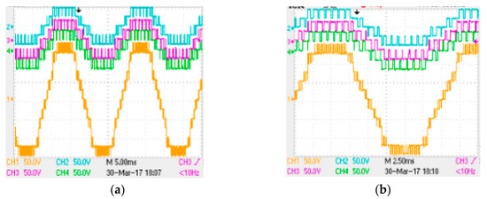 The output voltage waves of the three-model 3L-NPC cascaded converter are shown in Figure 19. Three 3L-NPC models were cascaded, thus the output voltage wave of each inverter was 5-level and the wave of the 3L-NPC cascaded converter was 13-level. The output voltage waves of the experiment were stable with the theoretical analysis.