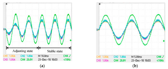 The output current waves of the three parallel traction substations and the load voltage wave. (a) The waves under the adjusting state and stable state; (b) the relationship between the current waves and the load voltage wave under the stable state (CH1: the output current of the SS1; CH2: the output current of the SS2; CH3: the output current of the SS3; CH4: the voltage of load.).