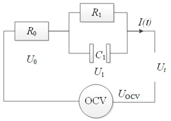 Hu et al. [20] compared 12 different equivalent circuit models (ECM) in terms of the complexity, accuracy, and robustness with two battery systems (lithium iron phosphate and ternary cathode NCM). They found that the first-order Thevenin model is the best for SOC estimation. Here, we follow their findings and choose the first-order Thevenin model, as shown in Figure 1, which simulates well the resistive and capacitive characteristics of the battery in both static and dynamic processes.