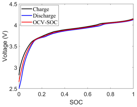 The OCV-SOC curve is obtained by averaging the charge and discharge curve of the rate of C/25 [21] at 25 °C, as shown in Figure 2. The OCV-SOC curve can be well fitted by a six-order polynomial, with an R-square of 0.998, given by: