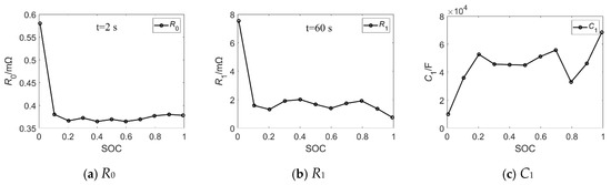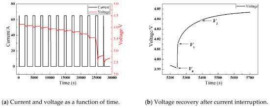 Model parameters at different SOCs are estimated with the current step method, as shown in Figure 3a. The voltage profile in response to the current step at 80% SOC is shown in Figure 3b. The parameters R0, R1, and C1 are estimated in the voltage recovery process after interrupting the current. V0 represents the terminal voltage at the moment of interrupting the current, V1 represents the terminal voltage which is 2 s later than V0, and V2 represents the terminal voltage which is 60 s later than V1. R0 was calculated using:
