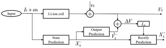 The AEKF [24] method uses as the state space, the current as the input, and the terminal voltage as the output of the system. Equations (1) and (5) are transformed to the following form: