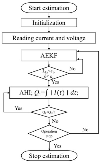 To obtain high-precision SOC estimation at an acceptable cost, we propose an alternate method by combining the AHI method and the AEKF method. Figure 6 shows a detailed flowchart of the proposed method.
