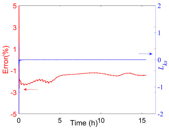In this work, our experimental current and voltage data were collected using a high accuracy Maccor series 4000H which has a voltage acquisition accuracy of 1 mV and a current acquisition accuracy of 0.02 A. Considering the high acquisition accuracy of the equipment, the collected data are considered as true values. The true SOC value is calculated off-line using the AHI method. The SOC estimation error and SOC correction parameter Lks(k) in the AEKF method are shown in Figure 7, showing that the SOC estimation error is smaller than −3% and maintains between –3% and –1% when the SOC correction parameter Lks(k) converges to zero. If both absolute SOC correction Lks (ASCL) and the absolute deviation of SOC correction Lks at the adjacent estimation step (ADSCL) converge to zero, the SOC correction parameter Lks(k) will converge to zero. Therefore, and are chosen to be the threshold value of the ASCL and ADSCL, respectively, to make sure the AEKF method has obtain the accurate SOC estimation. Therefore, Equation (11) is used as the switching condition. It is important to identify the thresholds of the absolute SOC correction Lks (ASCL) and the absolute deviation of SOC correction Lks at the adjacent estimation step (ADSCL) as discussed in Figure 8.