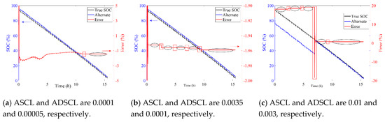 SOC estimation process and errors using alternate method with ASCL and ADSCL of different values.