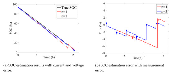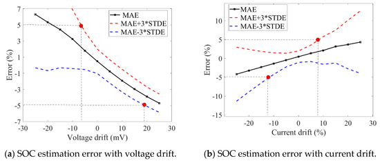 Figure 12 shows the SOC estimation errors using the AEKF method with different drift levels of current and voltage. Figure 12a shows the influence of voltage drift on estimation error and Figure 12b shows the influence of current drift on estimation error. It can be seen that MAE almost has a linear relationship with voltage or current drift error. The upper and lower error boundaries increase with voltage and current drift errors. Figure 12 shows that if we want to limit the SOC estimation error within ±5%, the voltage and current drifts should be within −6.7~19.3 mV and −11.6~8.7%. Usually, the drift errors of the voltage and current measurement sensor in the BMS are symmetric [26]. Therefore, the voltage and current drift errors cannot exceed ± 6 mV and ± 8%, respectively.