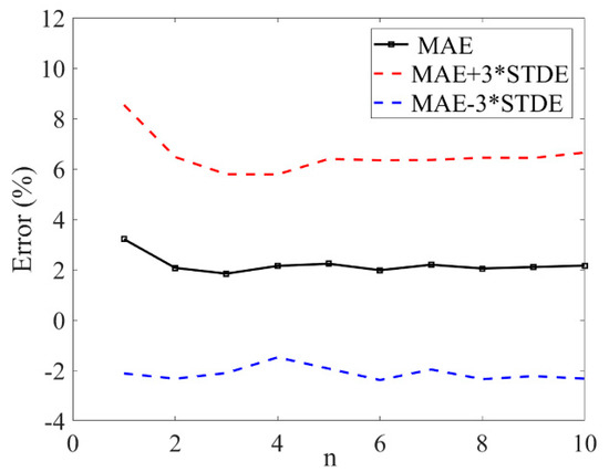 The suitable switching condition from AHI to AEKF is investigated with the voltage drift of +6 mV and current drift of −8% under the NEDC condition. Figure 9 shows the SOC estimation process and the corresponding estimation error under different switching conditions: n = 1 and n = 3. The SOC estimation error occasionally exceeds the error limit of 5% under the switching condition of n = 1. However, the SOC estimation error can be corrected effectively under the switching condition of n = 3. There exist two and five switches from AHI to AEKF for n = 1 and n = 3, respectively. The switching times from AHI to AEKF increases with n. Therefore, it is necessary to find the suitable value of n to guarantee the accuracy of SOC estimation and to shorten the process of SOC estimation using the AEKF method to reduce the computational burden. Figure 10 shows the MAE and the STDE of the SOC estimation error with different values of n. The results show that the MAE and the STDE decrease as n increases from 1 to 3. And when n is larger than 3, both MAE and STDE remain stable. Therefore, n = 3 is chosen as the suitable switching condition from AHI to AEKF.