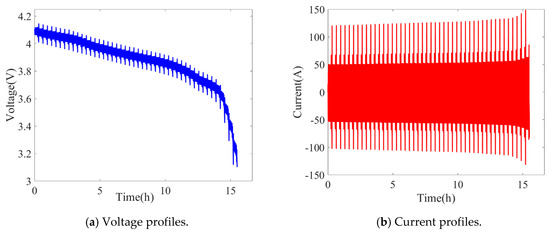 The collected current and voltage data of NEDC profile are shown in Figure 11, where negative current represents charge and positive current indicates discharge. The decreasing trend in the battery voltage indicates that discharge was the main process in the test. Note that all experiments were conducted in a thermal chamber at 25 °C.