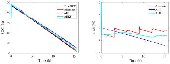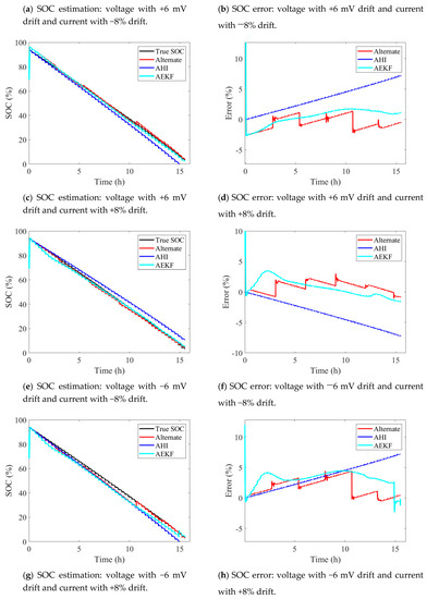 Figure 13 shows the true SOC and estimation results and the corresponding estimation errors in the NEDC operation condition at 25 °C, respectively. The results show that the AEKF and alternate method can obtain accurate SOC estimation results in the whole operation even with inaccurate initial SOC and the current and voltage with ± 6 mV and ± 8% drift. In contrast, when the current is measured with drift errors, the SOC estimation errors of the AHI method grow in the process even with the true initial SOC value. The MAE, MAXE, RMSE, STDE, and the calculation time of the AEKF, the AHI, and the alternate method are shown in Table 4 with voltage drifts and current drifts as shown in Table 3. In addition, the calculation time is obtained by MATLAB software on a Thinkpad E450 PC produced by Lenovo, Beijing, China with Intel Core i7-5500U CPU produced by Intel, @2.40 GHz and 16.0 GB RAM.