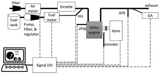 To calculate the heat release rate and total heat release rate, cylinder pressure was measured using a piezoelectric sensor D322D6-SO (Optrand, Inc., Plymouth, MI, USA). The shaft of the engine was equipped with an angular encoder to provide a reference for electronic control. The engine was fully controlled and monitored using a lab-made control system based on NI (National Instruments Corporation, Austin, TX, USA) real-time hardware (CompactRIO) with LabVIEW interface. The signals from the dynamometer, mass flow meter, temperature and pressure sensors, and gas analyzer were also logged, compiled, and stored in the PC for further analysis. The signals were collected for 60 s as the engine rpm reached steady, and the sampling rate was 20 Hz. The standard deviation to 1σ was statistically calculated based on measured data and shown in the following figures. The test facilities and engine platform are shown schematically in Figure 2. For engine performance measurements, gasoline (Research octane number, RON = 92 by CPC) was used. The fermented ethanol alcohol (by ECHO Chemical Co., Ltd.), which is guarantee reagent (GR) grade containing 5% water, was used to blend with gasoline for ethanol fuels. The blending ranged from 3% to 85% ethanol. During engine operation, the engine speed was fixed at 4500 ± 50 rpm, and the air to fuel ratio was varied to maintain stoichiometric combustion. The ignition time was considered as the crank angle for maximum pressure. The ignition time was set at the stoichiometric value for gasoline (with Research octane number, RON = 92) and was maintained during valve timing and fuel evaluations unless the engine could not be maintained at 4500 ± 50 rpm. The measurement ranges and uncertainties for major apparatus are listed in Table 2.