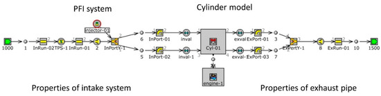 The single-cylinder engine model is shown in Figure 3 The general input parameters included the detailed geometry of intake and exhaust pipes, the geometries and layout characteristics of valves and cams, ignition time, fuel injection time, bore size, stroke, length of linkage, compression ratio, air to fuel ratio versus engine speed, and a user defined function for ethanol/gasoline simulation. The initial conditions for the simulation settings are listed in Table 4.