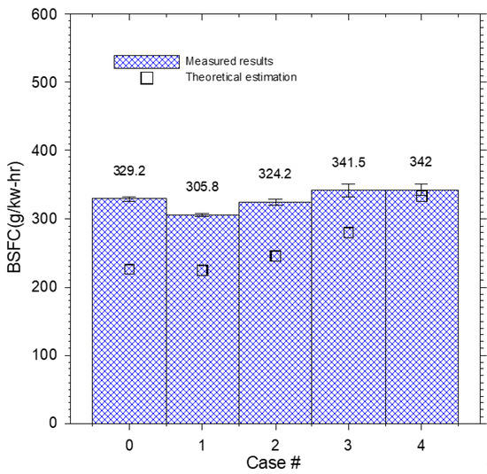 Comparison of measured and theoretically estimated brake specific fuel consumption (BSFC) for different valve settings.