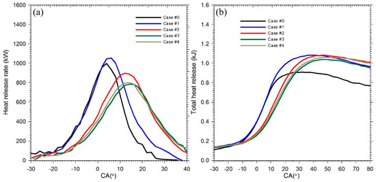 BSFC is an important engine parameter and allows for the comparison of different engines. It is the ratio of fuel consumption to the power produced. The real-time measured BSFC is calculated based on measured fuel consumption and work output measured by the dyno. For numerical simulation, the BSFC can be obtained in calculation results. The theoretically calculated BSFC as well as the measured results with error bars were compared and shown in Figure 4. Note that the brake specific fuel consumption is defined as the ratio of the fuel consumption rate to the power produced. According to theoretical calculations, the lowest BSFC value occurred for case 1. The measured results showed a similar trend to the theoretical calculations. For measured results, the maximum fluctuation was 7.9% for case 3. Generally, the default setting of a commercial engine does not have the best BSFC. Indeed, as the ECR was increased, the BSFC was also affectedly reduced for short stroke engines. The simultaneous heat release rate, which is defined in Equation (3), describes the relationship between crank angle and the various valve settings.