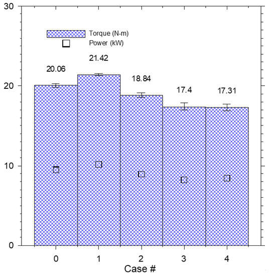 The heat release rate and the total heat release rate during the single cycle of engine operation are shown in Figure 5. Higher heat release rate induces higher chamber pressure and greater force acting on the piston to produce higher power and torque. As shown in Figure 5a, the maximum heat release rate occurred in case 1. The accumulated heat release profile, which was calculated via Equation (4), is shown in Figure 5b. Despite the accumulated heat release in case 2 being similar to that in case 1, the peak in simultaneous heat release was delayed due to lower combustion flame speed as the effective expansion stroke was increased. Note that the ignition time was fixed at 315°. The power and torque corresponding to different valve timing settings are shown in Figure 6 The results show that the maximum values of both torque and power occurred in case 1 reached 21.42 N-m and 10.17 kW, respectively. The torque and power output decreased as the ECR was increased. The emissions, including CO, HC, and NO, are shown in Figure 7 The CO and HC emissions monotonically decreased as the expansion to compression ratio increased. However, the NO reached its maximum value in case 1. The intake and exhaust valve settings in case 1 showed relatively better performance, and hence were used to further study the application of bioethanol/gasoline blended fuel.