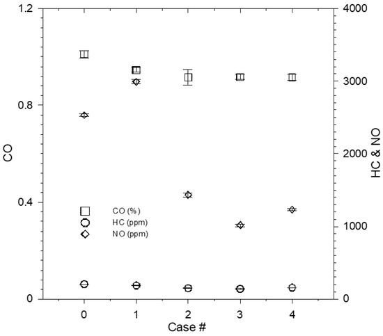 From the analysis of Figure 4, Figure 5, Figure 6 and Figure 7, we can see that the engine running on case 1 conditions had the lowest BSFC value, which also indicates that the engine had the best combustion efficiency under the same fuel injection amount. This can be verified by Figure 5a for case 1. After the compression at TDC (CA 4°), the instantaneous heat release rate (HRR) reached the highest value and was significantly higher than the other cases. However, for the condition of case 1, NO generation was also the highest one, which was due to the high temperature of fuel burning in the combustion process. This result also agrees with the results presented in Figure 5a,b. Furthermore, it can be seen from Figure 4 that when the ECR was near 1.0, the internal exhaust gas recirculation value (I-EGR) of the engine can be estimated. The increase in I-EGR caused deterioration of the internal combustion efficiency of the engine, as can be seen from Figure 5, and the highest value of HRR also decreased that affected the torque output. This result also reflected in the increase of the BSFC values of cases 2, 3, and 4 when increasing the ECR values.