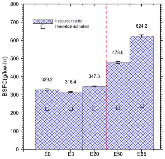 Estimated and measured BSFC for ethanol/gasoline blended fuel.
