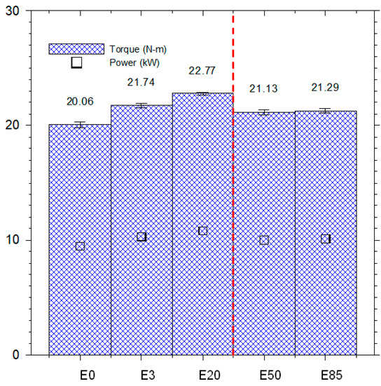 Figure 8 is the corresponding BSFC trend diagram obtained by experimental measurement data and 1D numerical calculation using commercial code, GT-POWER, wherein the hollow square symbols in the figure indicate the numerical values obtained by numerical calculation. The theoretically estimated BSFC values for E3, E20, E50, and E85 demonstrate no significant change when compared to regular gasoline. The measured BSFC for E3 shows the lowest value compared to regular gasoline (E0) and other bioethenols E20, E50, and E85. It is interesting to note that with the same ignition time (315°), it was not easy to maintain steady engine operation and reach 4500 rpm using E50 and E85. Hence, the ignition time was tuned earlier by shifting to 302°. The measured results are also plotted in Figure 8 and divided by a red dashed line. As the composition of ethanol in the blended fuel was increased, the BSFC values also increased. The torque and power output for different blended fuels are shown in Figure 9. The results for E3 and E20 show an improvement in torque and power when compared to regular gasoline fuel. The superior performance of ethanol blended fuel can be attributed to the higher-octane number and the improvement in engine volumetric efficiency due to higher latent heat of ethanol. However, a higher composition of ethanol in the blended fuel induced not only a lower heating value but also lower flame propagation speed. Therefore, the performance of E50 and E85 was worse than that of regular gasoline and produced higher HC and CO emissions, as shown in Figure 10. The CO and HC emissions increased dramatically due to incomplete combustion. The various NO emissions are shown in Figure 9 and generally appeared to be lower in ethanol blended fuels compared to regular gasoline. However, E3 produced higher NO emissions than regular gasoline.