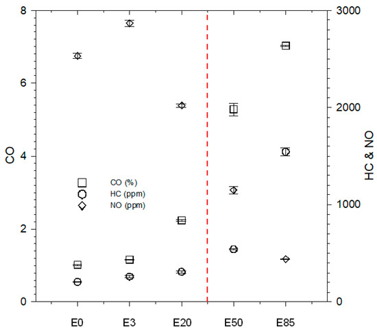 Emissions of CO, HC, and NO for ethanol/gasoline blended fuel.