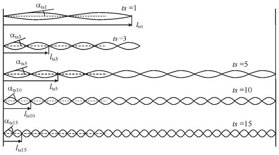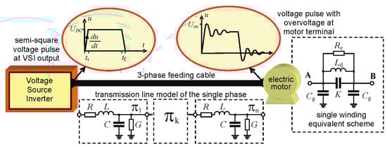 The stator windings design of low voltage three-phase electric motors for industrial applications (with the rated phase-to-phase voltage Up-p up to 690 V) are usually in form of random-wound windings inserted into the slots [8,9], where the magnet wires (copper or aluminum round wires coated with thin layers of insulation) form a common system of coils with not precisely defined mutual position of particular turns (Figure 1), resulting in various turn-to-turn and coil-to-coil voltage distributions. A basic setup of induction motor controlled by voltage source inverter of VSD is presented in Figure 2. A modulated sequence of almost rectangular voltage pulses, generated by inverter, is fed to terminals of the three-phase motor via a feeding cable (in industrial applications having length up to tens of meters or more), which for fast rising/falling voltage pulses can be treated as a long transmission line. For voltage inverters based on very fast switches, the rise times of voltage pulses can be in the order of 10−10 s, and the voltage slew rate can be significantly greater than 1 kV/µs (i.e., greater than 109 V/s). The accompanying physical phenomena occurring in electrical circuits lead to significant overvoltages and oscillations at the motor terminals and in the cable. The length, characteristic impedance and per unit electrical parameters of the feeding cable have important meaning for working of inverter-cable-motor system, because in many situations can result in unwanted resonances and oscillations [3,7,10,11].