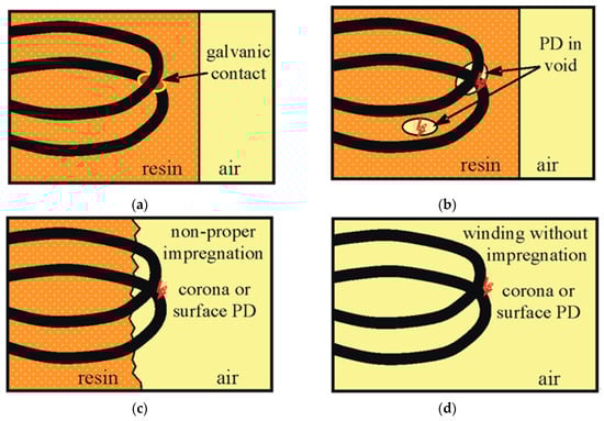Specific defects of random-wound windings insulating systems: (a) turns short-circuit, (b) gaseous void between or adjacent to winding wires, (c) and (d) corona or surface discharges at contacting wires in air.