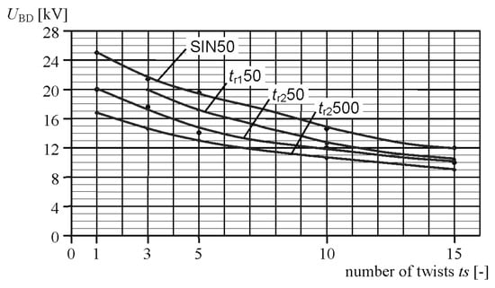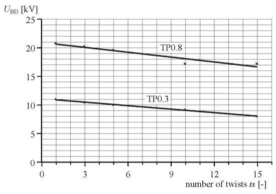 The assessment of insulation quality of enameled wires was based on a comparison of the breakdown voltage at sinusoidal voltage for twisted-pair samples containing various numbers of twists ts: 1, 3, 5, 10 and 15, as illustrated in Figure 5. The breakdown voltages UBD for samples 0.3 mm (TP0.3) and 0.8 mm (TP0.8) are shown in Table 1 and Figure 6.