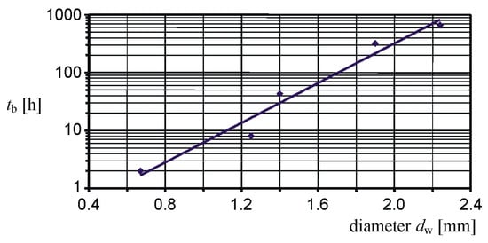 For wires with different diameters, long-term tests were performed to determine the time to breakdown of polyamide-imide insulation of wires for PWM type voltage. For the tests, six twisted-pair samples were prepared for each wire diameter, with the same insulation. As a test voltage source, a semi-square pulse voltage generator with a voltage of 1 kV and a repetition frequency of 10 kHz was used. In each of the tested twisted-pair one wire was grounded and the test voltage was applied to the other. The analysis of the test results (shown in Figure 9) indicates that during the accelerated aging test, a significantly shorter average life-time has the insulation of wires with a smaller diameter.