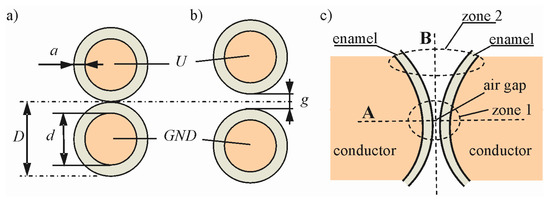 The TP insulation system consists of two layers of enamel covering the wires and the air surrounding the wire (Figure 10a). If the wires do not touch directly, a thin layer of air between them creates an additional serial microgap g (Figure 10b).