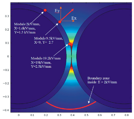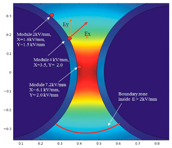 The 2D electric field strength distribution for simplified model of two parallel magnet wires of 0.7 mm diameter, with direct contact (g = 0 mm), is presented in Figure 12. In the figure are marked three selected points with significantly different values of the electric field strength on the surface of the wire insulation. The first point, located near the wires contact point, has a very high field strength value (E > 19 kV/mm). At the second point, slightly distant from the wires contact point, the field strength is still high and is equal to approx. 9.5 kV/mm. The third point determines the place on the surface of the wire insulation, where the field strength decreases below 2 kV/mm.