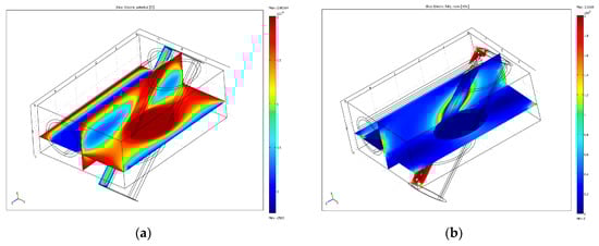 The 3D electric potential (a) and electric field strength (b) distribution in twisted-pair with wire diameter 0.7 mm, for α = 45°, at 2 kV.