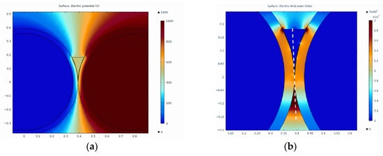 The long-term experiments performed on TP samples show that the partial discharge and PD development process transition through various phases during the insulation degradation process. One can assume that a very high electric field in the zone adjacent to the contact point causes an ionization of the surrounding air-gap along with surface potential decay [23]. While increasing the voltage level, the ionization triangle zone (depicted in red in Figure 15) will enlarge, resulting in an increase of PD inception voltage level. A visualization of this effect, assuming surface conductivity in the triangle boundary area equal to 107 S/m, up to the boundary field level 2 kV/mm, at voltage 1 kV is shown in Figure 16. This effect is also shown graphically in Figure 17, plotting electric field distribution along the white marked cross section depicted in Figure 16b. The left part of the plot corresponds to the ionized zone and the right part represents the air slice without discharges.