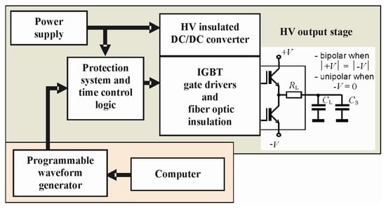 Block diagram of IGBT modules-based pulse voltage generator (6 kV/±3 kV).