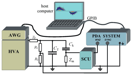 General block diagram of the laboratory system used for PRPD data acquisition: AWG—arbitrary waveform generator, HVA—high-voltage amplifier, SCU—signal conditioning unit, PDA—PD Analyser, GPIB—IEEE.488 interface, CT—capacitance of tested object, Ck—coupling capacitor, Zm—measuring impedance, R1/R2—HV divider, Zf—impedance of HV filter.