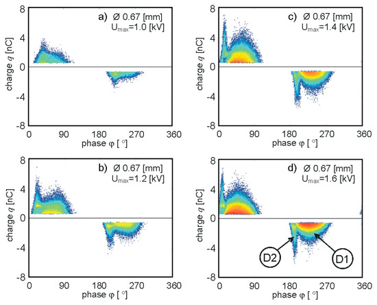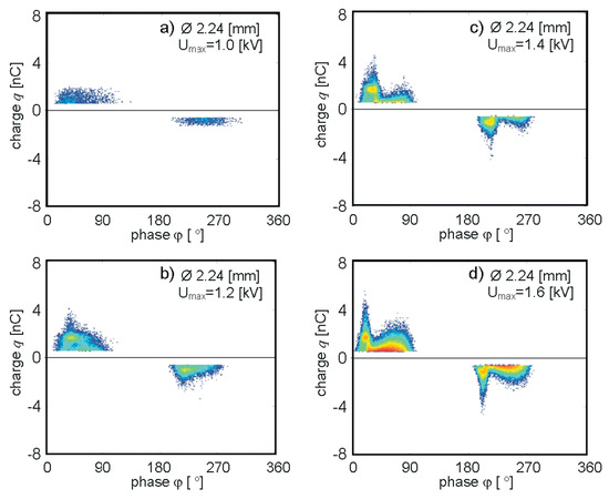Partial discharges for every sample were recorded in 60-second measurement intervals at increasing test voltage; starting from the inception voltage Ui (determined during test as the voltage at which at least one PD pulse occurs statistically in one voltage period). When taking measurements on TP samples, it was found that the Ui value is in the range from about 900 V to about 1000 V, so for each of the TP sample PRPD patterns were recorded for test voltage increasing up to 1600 V. The PRPD patterns shown in Figure 21 and Figure 22 were acquired from TP1 and TP2 samples at four values of testing voltage Umax = 1.0 kV, 1.2 kV, 1.4 kV, and 1.6 kV.